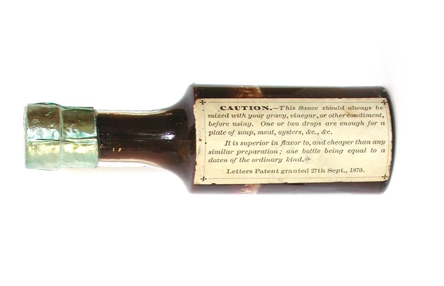 The only known completely intact early bottle of TABASCO Sauce, circa 1875(?). Note the rear “Caution label” mentioning the condiment’s use on oysters. (McIlhenny Company Archives)